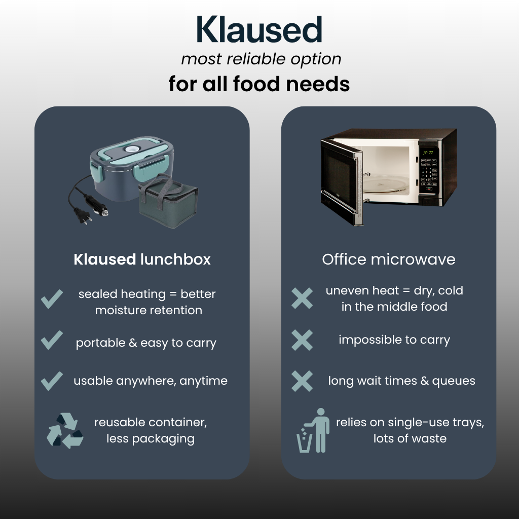 Our electric lunchbox warms food from the bottom and sides, using a constant, even heat instead of quick radiation. This allows the entire meal to warm through evenly, so the center gets hot, no cold spots like in a microwave.